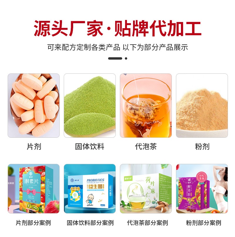 固體飲料、 粉劑、 片劑、代用茶、 袋泡茶、 壓片糖果、 代餐粉/奶昔、膠原蛋白肽、膳食纖維等